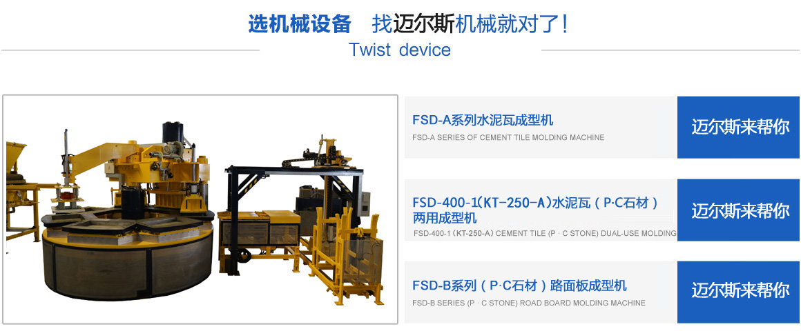 常熟市邁爾斯機械有限公司是一家集研發、生產、銷售于一體的建材機械高科技企業,其前身為2011年注冊創辦的“常熟市虞山鎮豐順達機械配件廠”,經過多年的努力,于2017年注冊成立“常熟市邁爾斯機械有限公司”,專業生產模壓水泥彩瓦機、P.C石材機、轉盤式成型機、彩色路面磚機等綠色建材設備。公司以市場為龍頭,以技術為導向,開發了系列化、標準化的適銷對路的機械產品,并且注冊了多項國家專利技術,銷售范圍覆蓋全國,并且出口越南、老撾等東南亞和其它國家。